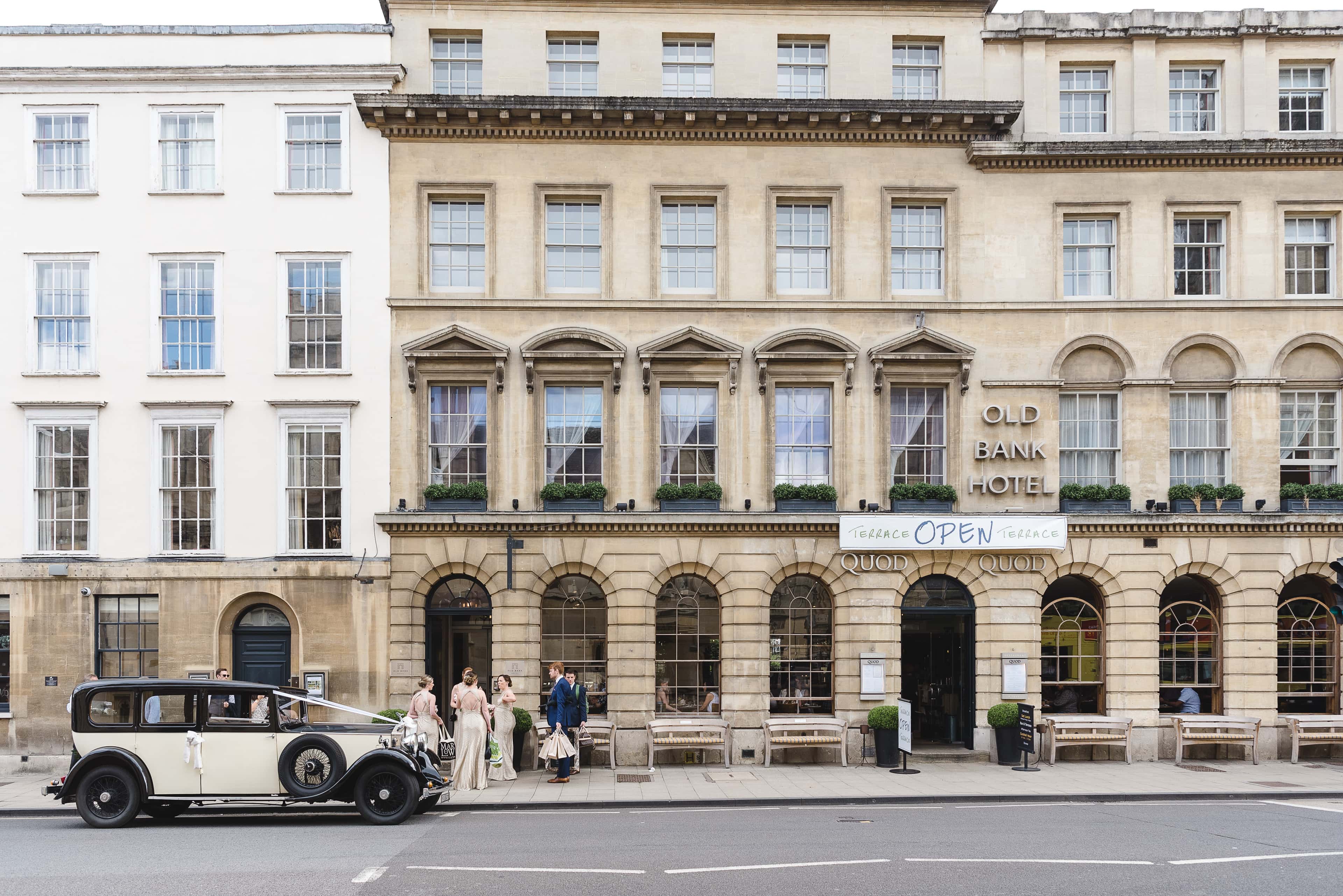 2021 - Old Bank Hotel - Oxford - High Res - Rebecca & Adam Wedding Facade Building Exterior Vintage Car - Web Hero
